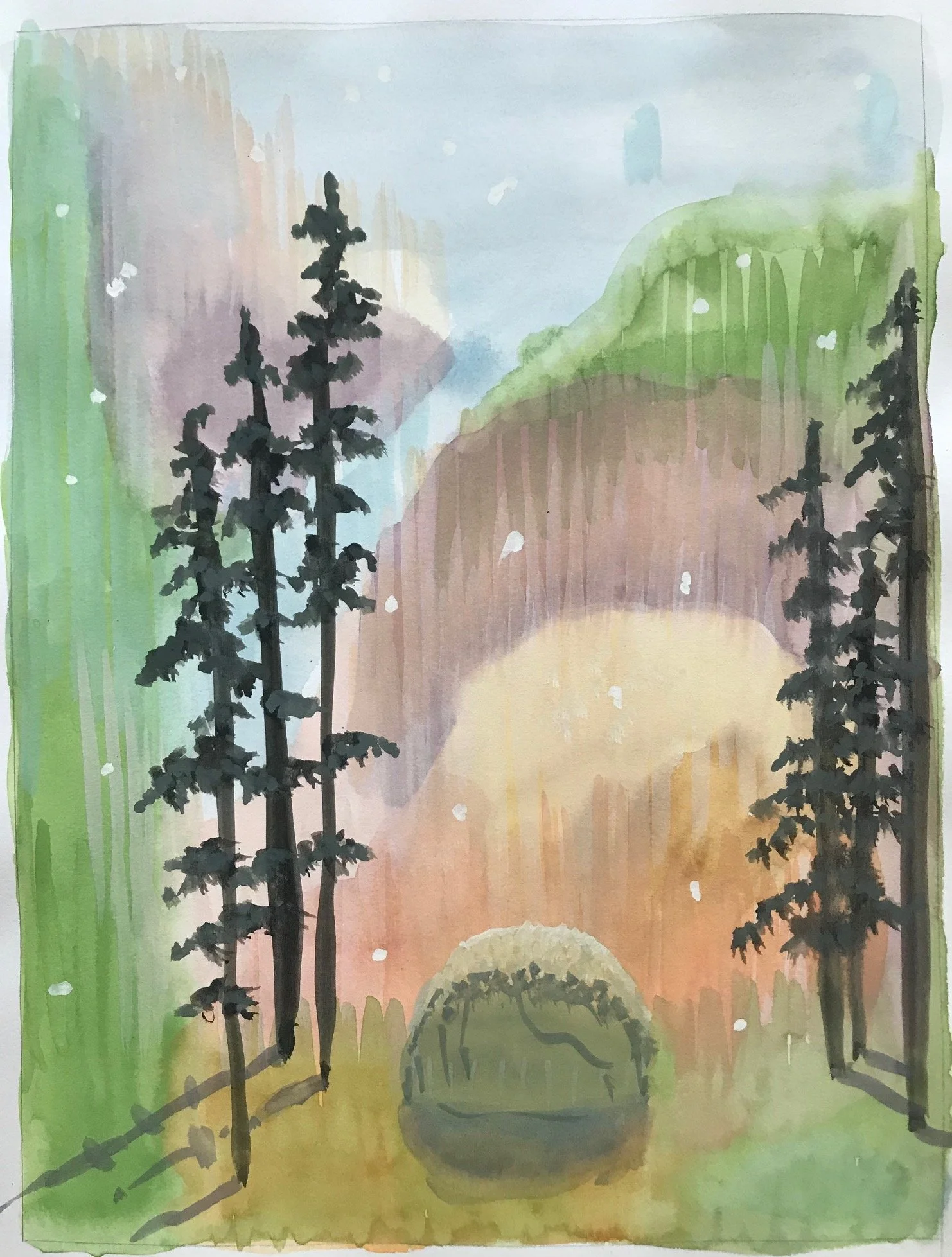 When first planning my October 2023 show at Sullivan Goss Gallery, I knew I wanted to make a shift in my color palette. At the time I was in the North Woods of Minnesota with a sketchbook and box of gouache paints. Using my setting as a subject I gave myself free rein on colors for a series of sketches. Below is one of the sketches.