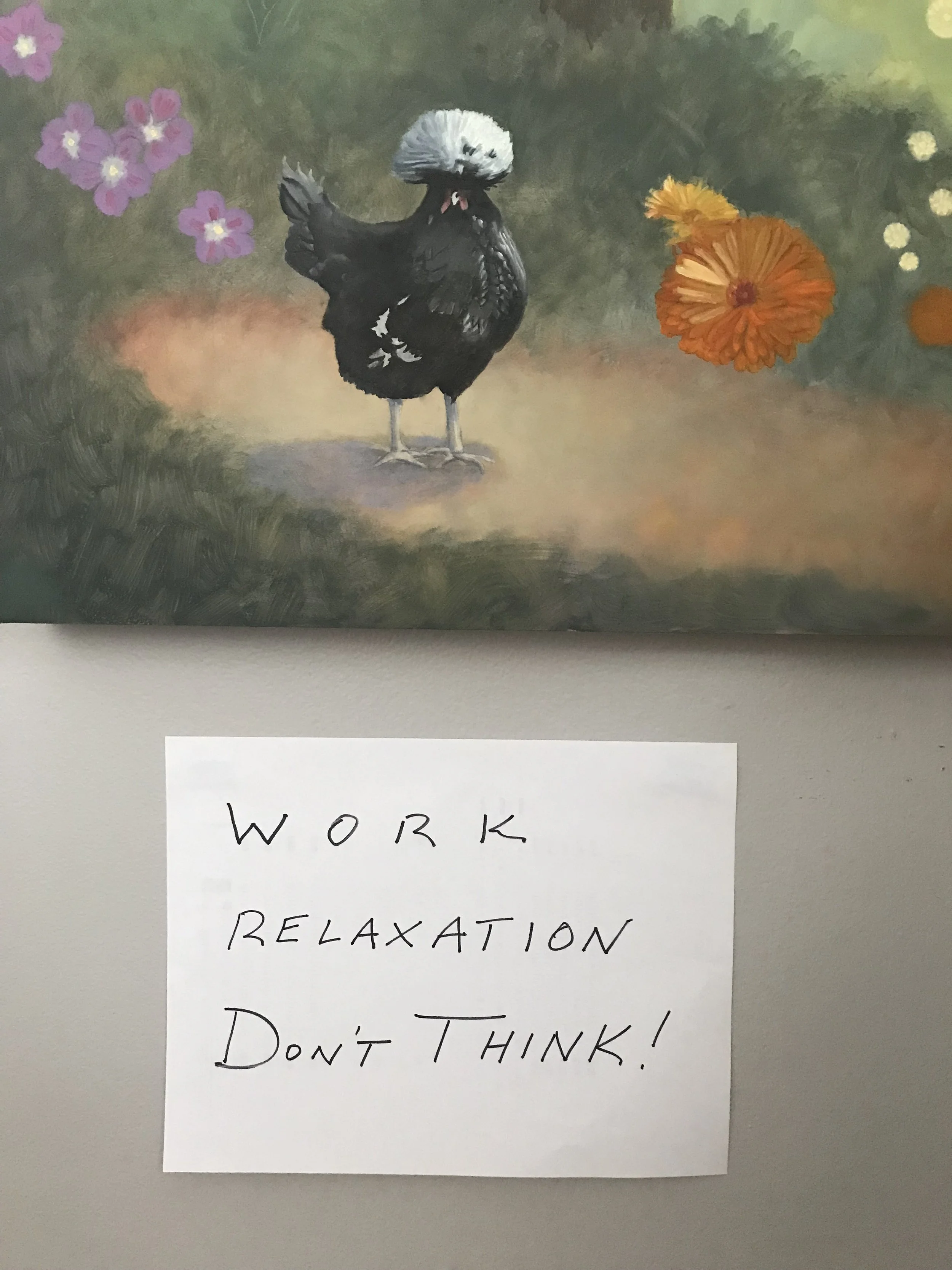 The natural outcome of being in the zone. I have a sign on my studio wall with these directives. And while DON’T THINK! is a natural outcome of work and relaxation, it’s the one that gives me trouble. Thinking likes to sneak in when the other two are going about their business. Particularly thinking on the target (results) which I know is a sure way to get out of the zone.